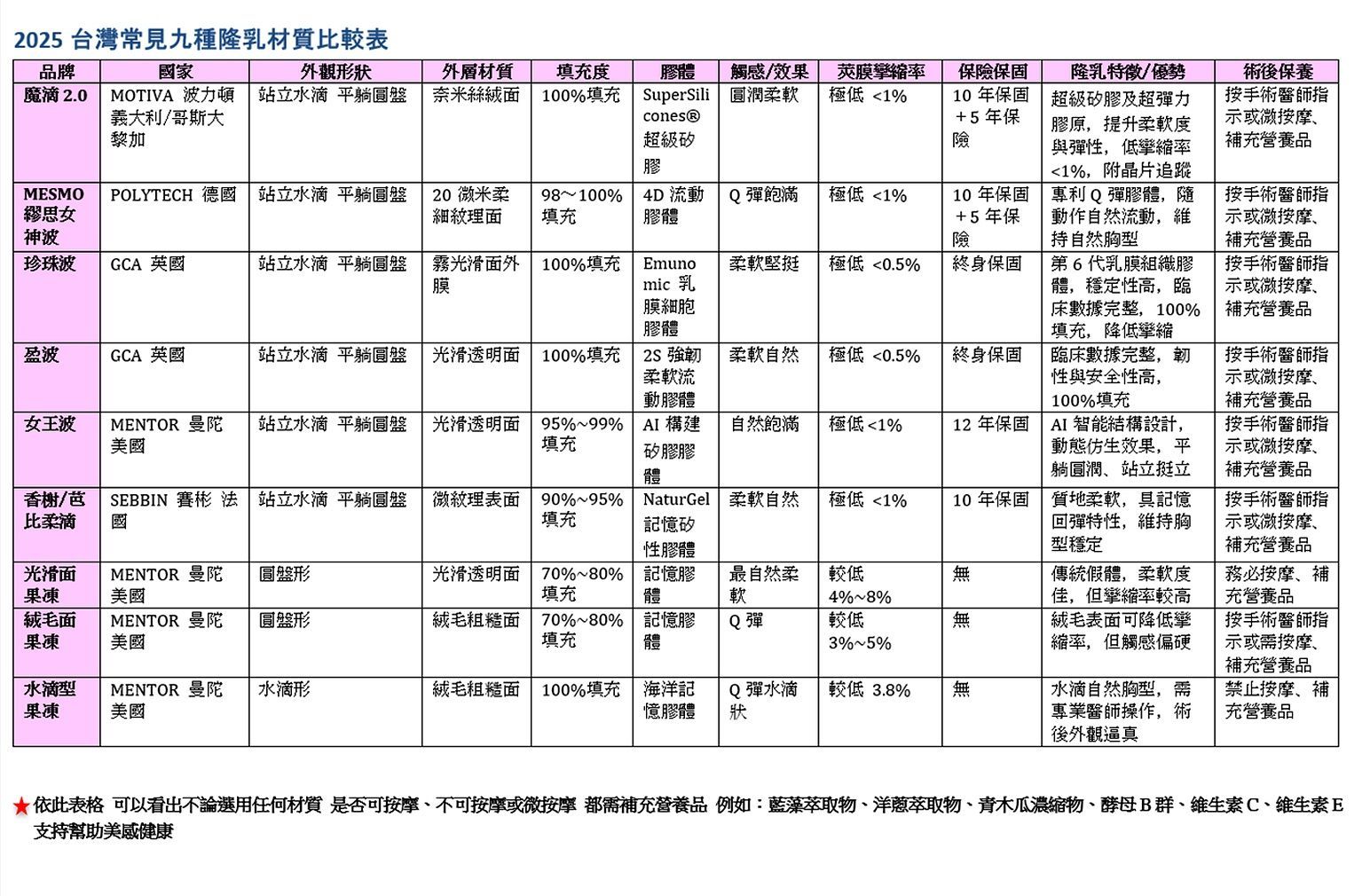 目前台灣常見的隆乳假體種類相當多樣,主要包含